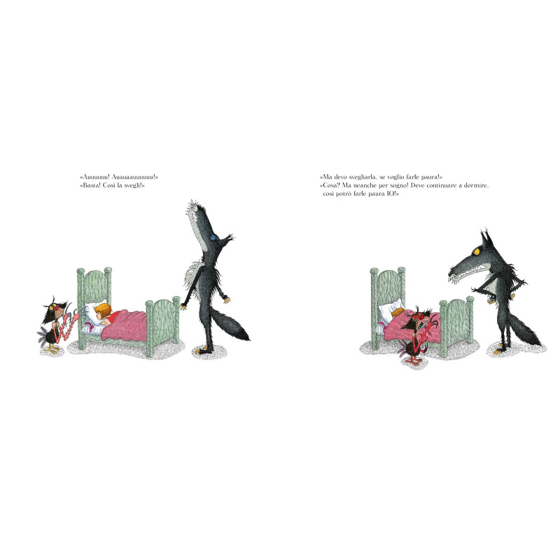 Un’esilarante fiaba moderna per sdrammatizzare le paure. Una notte, il lupo entra nella camera di una bambina addormentata per spaventarla. Ulula a più non posso, ma niente da fare, la piccola dorme come un ghiro. A un tratto, un mostriciattolo viene fuori borbottando da sotto il letto. È l’incubo della bambina e non vuole che lei si svegli per poterla terrorizzare a sua volta. Così, i due spaventatori di professione cominciano a litigare su chi debba far paura alla piccola e alla fine il lupo risolve la situazione a modo suo. Tolto di mezzo il guastafeste, sente avvicinarsi dei passi pesanti nel corridoio. Tutto quel baccano ha svegliato l’incubo della nonna, un altro mostro ma molto più grosso, che stava riposando dopo averla terrorizzata per bene. Forse potrà aiutare il lupo a svegliare la bella addormentata?