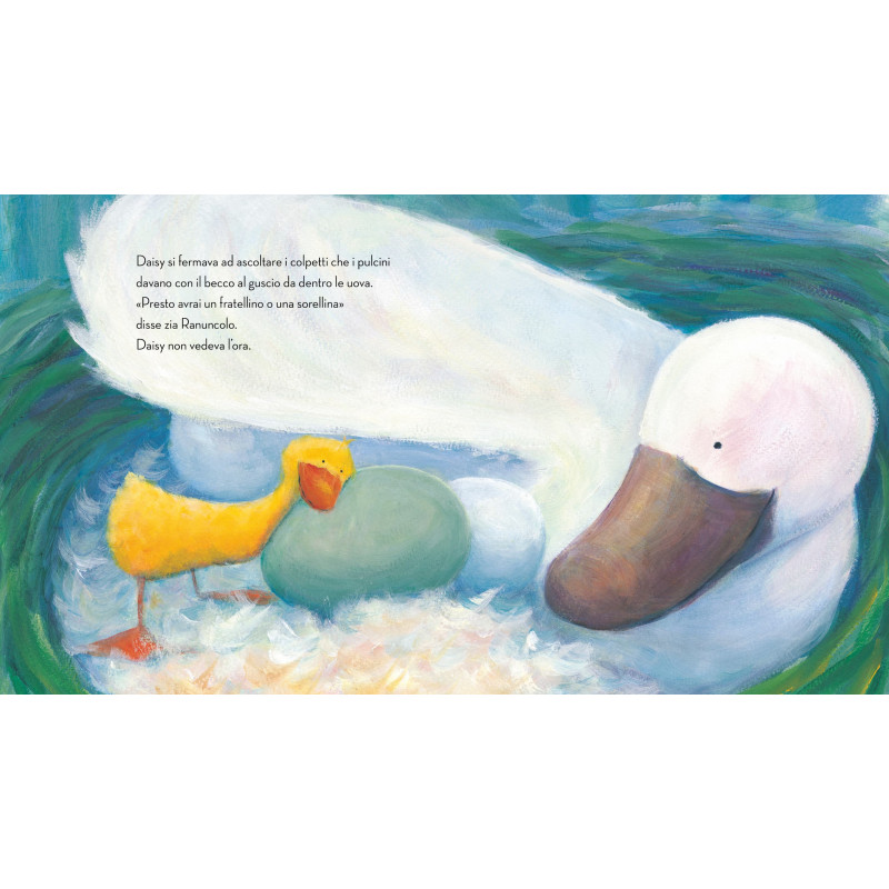 La tenera anatroccola Daisy è pronta ad assistere alla schiusa delle uova. Cosa ne uscirà? Daisy non sta più nelle penne: la Zia Camelia sta covando le uova e lei vuole sapere tutto su di loro! Quante sono? Di chi sono? Può covarne uno anche lei? Un uovo, quello verde, è di Mamma Anatra e la Zia Camelia lo sta covando per lei. La mamma le dà il permesso di covarlo ma Daisy è ancora piccola e riesce a fatica a starci sopra. Così, desiderosa di aiutare, porta ogni giorno da mangiare alla zia e aspetta impaziente il momento in cui dall’uovo della mamma uscirà un fratellino o una sorellina. Un giorno, finalmente, i gusci cominciano a rompersi ed escono i cuginetti di Daisy, che gioia! Sull’uovo verde, però, non compare nemmeno una crepa. Mamma Anatra dice che alcune uova non si schiudono mai, ma Daisy non è ancora pronta a rinunciare… Nel secondo volume della serie dedicata all’anatroccola Daisy, pubblicato nella collana “Gli albi della Ciopi”, ritroviamo le avvolgenti atmosfere blu e verdi delle illustrazioni di Jane Simmons e conosciamo più da vicino la sua simpatica protagonista scoprendone il lato più premuroso e risoluto. Ormai a suo agio nello stagno, Daisy è pronta a diventare una sorella maggiore, accogliendo con grande affetto un nuovo piccolo compagno di giochi.