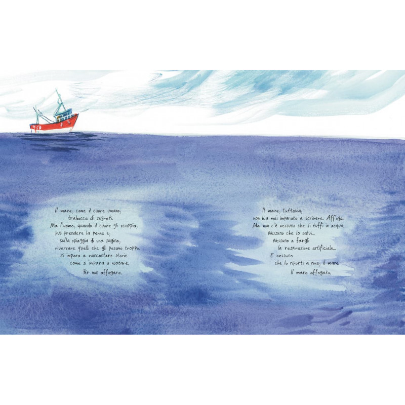 Un albo poetico e toccante che affronta i temi dell’amicizia e dell’amore per i libri e al contempo non rinuncia a puntare il dito contro la disumanità della caccia alle balene e la mancanza di rispetto ed empatia dell’uomo nei confronti delle altre forme di vita che popolano il pianeta. La storia, narrata in prima persona dal corriere della Posta, si accompagna alle suggestive illustrazioni dominate da intense tonalità di blu che ci immergono in un’atmosfera onirica e fiabesca.