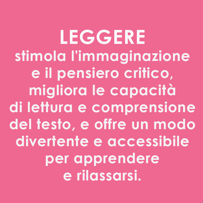 LEGGERE stimola l'immaginazione e il pensiero critico, migliora le capacità di lettura e comprensione del testo, e offre un modo divertente e accessibile per apprendere e rilassarsi. Nel caso dei libri illustrati la combinazione di immagini e testo allena il cervello mantenendolo attivo contribuendo a un senso di benessere generale.