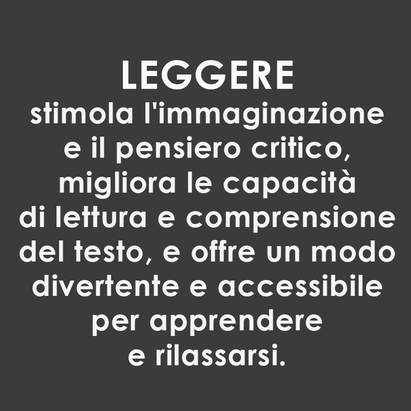 LEGGERE stimola l'immaginazione e il pensiero critico, migliora le capacità di lettura e comprensione del testo, e offre un modo divertente e accessibile per apprendere e rilassarsi. Nel caso dei libri illustrati la combinazione di immagini e testo allena il cervello mantenendolo attivo contribuendo a un senso di benessere generale.