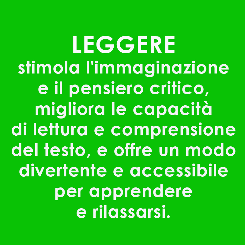 LEGGERE stimola l'immaginazione e il pensiero critico, migliora le capacità di lettura e comprensione del testo, e offre un modo divertente e accessibile per apprendere e rilassarsi. Nel caso degli libri illustrati la combinazione di immagini e testo allena il cervello mantenendolo attivo contribuendo a un senso di benessere generale.
