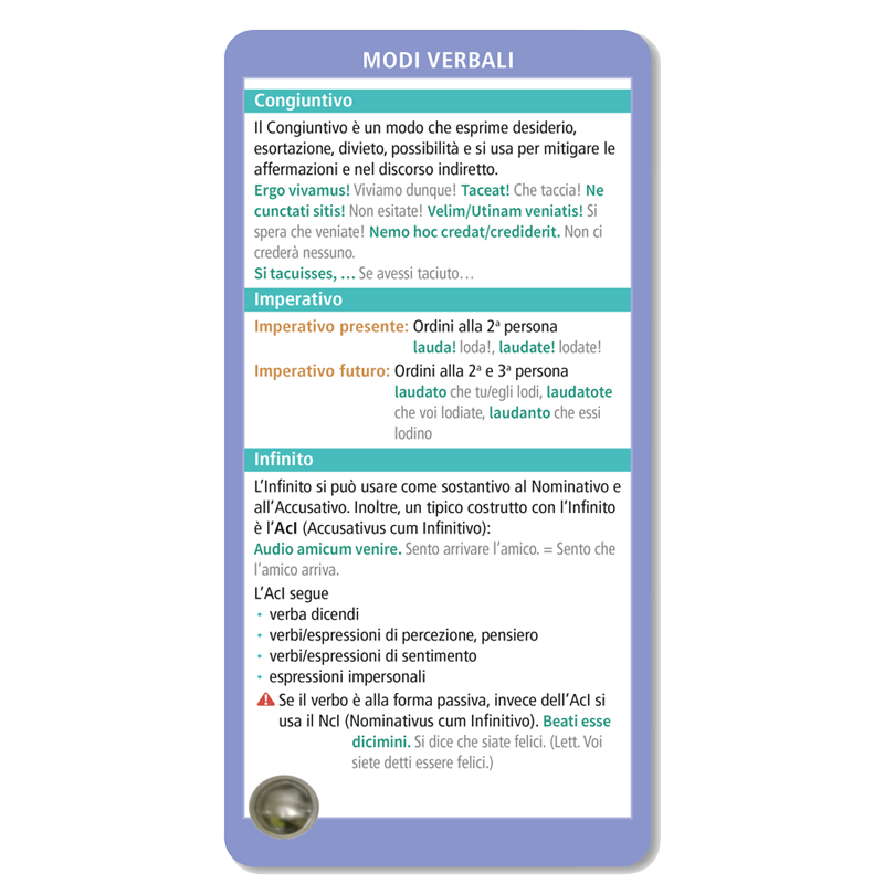 Tutto l’essenziale sui verbi latini in una nuova edizione tascabile, con esempi e spiegazioni sull’uso e coniugazione delle principali forme verbali. Da portare sempre con sé per una consultazione pratica e veloce, a colpo d’occhio!